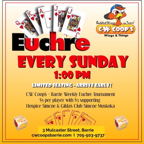 Join us every Sunday at 1 PM at CW Coops Barrie for an exciting afternoon of Euchre! Play, socialize, and compete in a friendly atmosphere while supporting two incredible local charities—Hospice Simcoe and Gilda’s Club. A portion of the proceeds goes directly to these organizations, helping those in our community who need it most. Whether you're a seasoned player or new to the game, all are welcome. Come for the cards, stay for the great company, and make a difference while having fun! See you Sunday! ♠️♥️♣️♦️