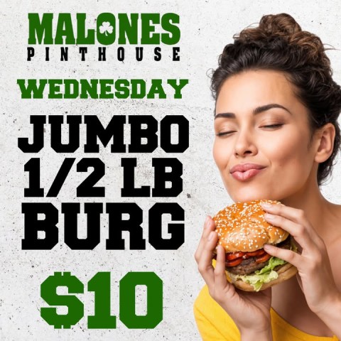 Every Wednesday, get Malones JUMBO 1/2 lb burg for just $10!